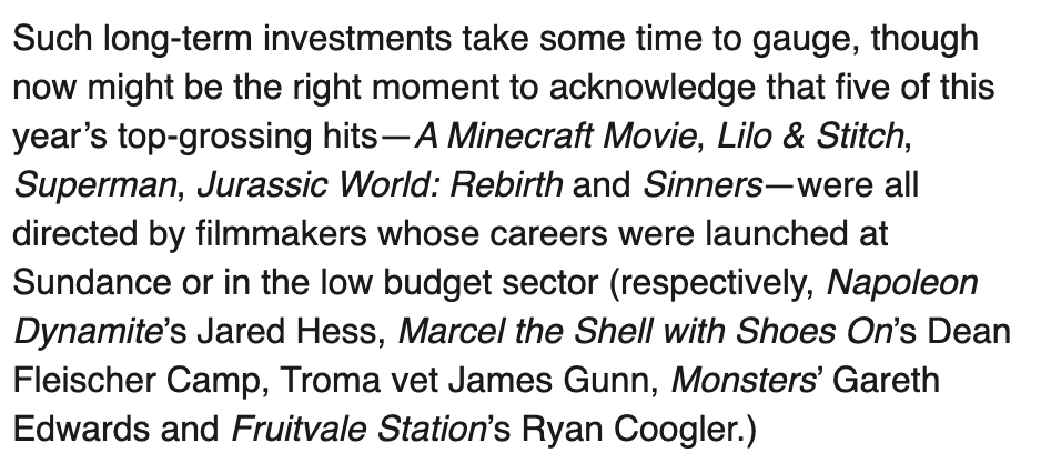 Is it anything more than just a farm league for The Studios? As Anthony Kaufman points out in his 2025’s Annual Sundance Hits & Misses Filmmaker Mag article: